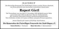 NACHRUFDie Freiwillige Feuerwehr der Stadt Bogen nimmt in tiefer Trauer Abschied von ihrem plötzlich und unerwartet verstorbenen KameradenRupert GietlDer Verstorbene war seit dem 27. November 1992 Mitglied unserer Wehrund ab dem Jahr 2024 als Beisitzer Teil der Vorstandschaft.Wir verlieren einen guten Freund und Feuerwehrkameraden.Sein Andenken werden wir immer in Ehren und guter Erinnerung halten.Seiner Familie gilt unsere aufrichtige Anteilnahme.Die Kameraden der Freiwilligen Feuerwehr der Stadt Bogen e.V.Simon Dotzler, 1. VorstandKlaus Kerscher, 1. Kommandant