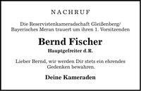 Nachruf Die Reservistenkameradschaft Gleißenberg/ Bayerisches Meran trauert um ihren 1. Vorsitzenden Bernd Fischer Hauptgefreiter d. R. Lieber Bernd, wir werden Dir stets ein ehrendes Gedenken bewahren. Deine Kameraden