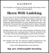 NACHRUF Die königlich privilegierte Schützengilde Straubing trauert um Ihr Ehrenmitglied Herrn Willi Lüdeking Er war mehr als 55 Jahre Mitglied der Schützengilde und hat während seiner aktiven Zeit als Sportschütze zusammen mit seinen Mannschaftskameraden einen Meistertitel bei den Deutschen Meisterschaften mit dem Perkussionsrevolver und zahlreiche Vizemeistertitel und Meistertitel in dieser Disziplin bei den Bayerischen und Niederbayerischen Meisterschaften errungen. Darüber hinaus hat er sich auch besondere Verdienste durch die Erstellung einer umfangreichen Chronik anlässlich der 750-Jahr-Feier der Schützengilde im Jahr 2005 erworben. Wir verlieren mit ihm einen guten Freund und Schützenkameraden. Wir danken ihm für sein überaus großes Engagement und werden ihm stets ein ehrendes Andenken bewahren. Unser tiefes Mitgefühl gilt seiner Familie. Kgl. priv. Schützengilde Straubing