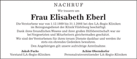 Nachruf Wir trauern um Frau Elisabeth Eberl Die Verstorbene war von 1.12.1989 bis 31.1.2008 bei den LA-Regio Kliniken im Reinigungsdienst der Klinik Vilsbiburg beschäftigt. Dank ihres freundlichen Wesens und ihrer großen Hilfsbereitschaft war sie bei Vorgesetzten und Mitarbeitern gleichermaßen geschätzt. Wir sind der Verstorbenen für ihren treuen Dienste dankbar und werden ihr stets ein ehrendes Gedenken bewahren. Den Angehörigen gilt unsere aufrichtige Anteilnahme. Jakob Fuchs Achim Oberndorfer Vorstand LA-Regio-Kliniken Personalratsvorsitzender LA-Regio-Kliniken