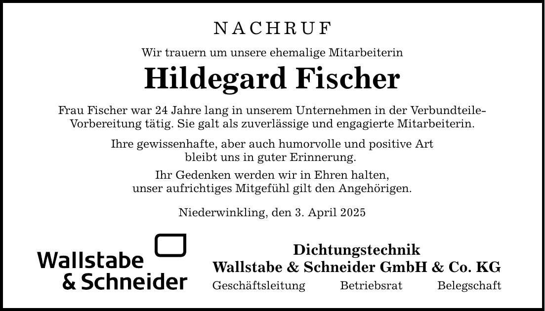 NACHRUF Wir trauern um unsere ehemalige Mitarbeiterin Hildegard Fischer Frau Fischer war 24 Jahre lang in unserem Unternehmen in der Verbundteile- Vorbereitung tätig. Sie galt als zuverlässige und engagierte Mitarbeiterin. Ihre gewissenhafte, aber auch humorvolle und positive Art bleibt uns in guter Erinnerung. Ihr Gedenken werden wir in Ehren halten, unser aufrichtiges Mitgefühl gilt den Angehörigen. Niederwinkling, den 3. April 2025 Dichtungstechnik Wallstabe & Schneider GmbH & Co. KG Geschäftsleitung Betriebsrat Belegschaft