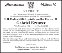 Heimatverein Velden e.V. nachruf Der Heimatverein Velden e.V. trauert um sein Gründungsmitglied und Mitglied der Vorstandschaft H.H. Erzbischöflich, geistlichen Rat Pfarrer i.R. Gabriel Kreuzer * 14. November 1932 + 11. Oktober 2025 Mit Leidenschaft und Sachverstand begleitete er den Heimatverein Velden e.V. als Gründungsmitglied und Mitglied in der Vorstandschaft seit 1993. Für alle Probleme des Vereins hatte er immer ein offenes Ohr und sein wertvoller Rat in allen Vereinsangelegenheiten waren immer gefragt und willkommen. Für die jahrelange Treue und Unterstützung bedankt sich der Verein herzlich. Wir werden in tiefer Verbundenheit ihm ein ehrendes Andenken bewahren. Oktober 2025 Im Namen des gesamten Vereins Brigitte Wutzer (Erste Vorsitzende)