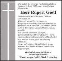 Wir haben die traurige Nachricht erhalten, dass am 9. April 2026 unser langjähriger Mitarbeiter Herr Rupert Gietl überraschend im Alter von 47 Jahren verstorben ist. Während seiner Zeit in unserem Ziegelwerk Straubing hat Herr Gietl seine Schaffenskraft und sein fachliches Können stets in den Dienst unseres Unternehmens gestellt. Wir trauern um einen fleißigen, gewissenhaften,hilfsbereiten sowie stets zuverlässigen und freundlichen Mitarbeiter. Wir werden ihn in guter Erinnerung behalten. Unser aufrichtiges Mitgefühl gilt seiner Ehefrau und seinen Kindern sowie allen Angehörigen. Wienerberger GmbH, Werk Straubing Geschäftsleitung, Betriebsrat und BelegschaftWir haben die traurige Nachricht erhalten, dass am 9. April 2026 unser langjähriger Mitarbeiter Herr Rupert Gietl überraschend im Alter von 47 Jahren verstorben ist. Während seiner Zeit in unserem Ziegelwerk Straubing hat Herr Gietl seine Schaffenskraft und sein fachliches Können stets in den Dienst unseres Unternehmens gestellt. Wir trauern um einen fleißigen, gewissenhaften, hilfsbereiten sowie stets zuverlässigen und freundlichen Mitarbeiter. Wir werden ihn in guter Erinnerung behalten. Unser aufrichtiges Mitgefühl gilt seiner Ehefrau und seinen Kindern sowie allen Angehörigen. Geschäftsleitung, Betriebsrat und Belegschaft der Wienerberger GmbH, Werk Straubing