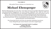 NACHRUF Mit großer Trauer nehmen wir Abschied von Michael Ebensperger Michael Ebensperger hat sich über viele Jahre hinweg mit großem Pflichtbewusstsein und persönlichem Engagement für seine Heimat eingesetzt. Von 1966 bis 1978 war er Mitglied des Gemeinderates der damaligen Altgemeinde Arth und brachte sich in dieser Zeit verantwortungsvoll in die kommunalpolitische Entwicklung ein. Darüber hinaus prägte er als Kommandant der Freiwilligen Feuerwehr Arth das Feuerwehrwesen vor Ort entscheidend und stand stets für Einsatzbereitschaft, Kameradschaft und Verlässlichkeit. Die Gemeinde Furth wird ihm ein ehrendes Andenken bewahren. Unser Mitgefühl gilt seiner Familie und allen Angehörigen. Im Namen der Gemeinde Furth b. Landshut Andreas Horsche Erster Bürgermeister