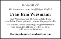 NACHRUF Wir trauern um unser langjähriges Mitglied Frau Erni Wiesmann Erni Wiesmann war 45 Jahre Mitglied und viele Jahre Kassenprüferin unserer Kolpingsfamilie. Wir danken ihr für ihre langjährige Vereinstreue und Freundschaft und werden sie stets in Erinnerung behalten. Kolpingsfamilie Landau / Isar e. V.