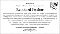 NACHRUF Mit großer Trauer nehmen wir Abschied von Reinhard Jeschor Reinhard Jeschor hat sich über viele Jahre hinweg mit großem Pflichtbewusstsein und persönlichem Engagement für seine Heimat eingesetzt. Von 1996 bis 2008 war er Mitglied des Gemeinderates der Gemeinde Furth und in der Zeit von 2002 bis 2008 Verbandsrat des Wasserzweckverbandes Pfettrachgruppe. In dieser Zeit brachte er sich verantwortungsvoll in die kommunalpolitische Entwicklung ein. Die Gemeinde Furth wird ihm ein ehrendes Andenken bewahren. Unser Mitgefühl gilt seiner Familie und allen Angehörigen. Im Namen der Gemeinde Furth b. Landshut Andreas Horsche Erster Bürgermeister