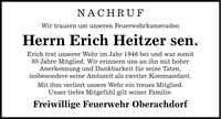 Nachruf Wir trauern um unseren Feuerwehrkameraden Herrn Erich Heitzer sen. Erich trat unserer Wehr im Jahr 1946 bei und war somit 80 Jahre Mitglied. Wir erinnern uns an ihn mit hoher Anerkennung und Dankbarkeit für seine Taten, insbesondere seine Amtszeit als zweiter Kommandant. Mit ihm verliert unsere Wehr ein treues Mitglied. Unser tiefes Mitgefühl gilt seiner Familie. Freiwillige Feuerwehr Oberachdorf