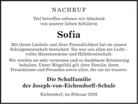 NACHRUF Tief betroffen nehmen wir Abschied von unserer lieben Schülerin Sofia Mit ihrem Lächeln und ihrer Freundlichkeit hat sie unsere Schulgemeinschaft bereichert. Sie war uns allen ein Licht - voller Herzenswärme und Hilfsbereitschaft. Wir werden sie sehr vermissen und in dankbarer Erinnerung behalten. Unser Mitgefühl gilt ihrer Familie, ihren Freundinnen und Freunden sowie allen, die um sie trauern. Die Schulfamilie der Joseph-von-Eichendorff-Schule Eichendorf, im Februar 2026