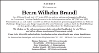 NACHRUF Wir trauern um Herrn Wilhelm Brandl Herr Wilhelm Brandl trat 1977 in die CSU ein und war aktives und engagiertes Mitglied im Ortsverband Plattling-Pankofen sowie in den Arbeitsgemeinschaften KPV, MU und SEN. Wilhelm Brandl hat sich zudem von 1990 bis 2008 als Stadtrat mit großem Engagement für das Wohl der Plattlinger Bürgerinnen und Bürger eingesetzt. Für seine Verdienste wurde er durch die Stadt Plattling mit dem goldenen Ehrenring sowie dem Ehrenbrief der Stadt ausgezeichnet. Wir blicken auf die vielen gemeinsamen Jahre mit großer Dankbarkeit für sein Wirken und vielen schönen gemeinsamen Erinnerungen zurück. Unser tiefes Mitgefühl und aufrichtige Anteilnahme gelten seiner Familie und seinen Angehörigen. Im Namen aller ehemaligen und aktiven Mitglieder der CSU / MU / SEN auf Orts- und Kreisebene. Thomas Emberger - CSU Ortsvorsitzender Bernd Sibler - CSU Kreisvorsitzender Hans Schmalhofer - 1. Bürgermeister Markus Schmid - MU Kreisvorsitzender Hermann Hilmer - SEN Kreisvorsitzender