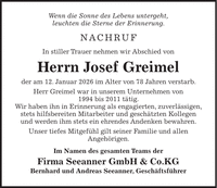 Wenn die Sonne des Lebens untergeht, leuchten die Sterne der Erinnerung. Nachruf In stiller Trauer nehmen wir Abschied von Herrn Josef Greimel der am 12. Januar 2026 im Alter von 78 Jahren verstarb. Herr Greimel war in unserem Unternehmen von 1994 bis 2011 tätig. Wir haben ihn in Erinnerung als engagierten, zuverlässigen, stets hilfsbereiten Mitarbeiter und geschätzten Kollegen und werden ihm stets ein ehrendes Andenken bewahren. Unser tiefes Mitgefühl gilt seiner Familie und allen Angehörigen. Im Namen des gesamten Teams der Firma Seeanner GmbH & Co.KG Bernhard und Andreas Seeanner, Geschäftsführer