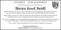 Nachruf - zum Gedenken Tief bewegt nehmen wir Abschied von Herrn Josef Seidl Die Gemeinde trauert um einen verdienten und erfolgreichen Kommunalpolitiker, der von 1972 bis 2002 als Gemeinderat der Gemeinde Kumhausen tätig war. Josef Seidl setzte sich in den 30 Jahren als Gemeinderat mit großem Sachverstand und Weitblick für eine erfolgreiche Entwicklung unserer Gemeinde ein. Für sein vielfältiges kommunalpolitisches Engagement erhielt Herr Seidl eine Vielzahl von Auszeichnungen, so in 2016 die Bürgermedaille der Gemeinde Kumhausen. Wir werden ihm in Dankbarkeit ein ehrendes Andenken bewahren. Seinen Angehörigen gehört unser Mitgefühl Gemeinde Kumhausen Thomas Huber, Erster Bürgermeister Nachruf - ZUM GEDENKEN Tief bewegt nehmen wir Abschied von Herrn Josef Seidl Die Gemeinde trauert um einen verdienten und erfolgreichen Kommunalpolitiker, der von 1972 bis 2002 als Gemeinderat der Gemeinde Kumhausen tätig war. Josef Seidl setzte sich in den 30 Jahren als Gemeinderat mit großem Sachverstand und Weitblick für eine erfolgreiche Entwicklung unserer Gemeinde ein. Für sein vielfältiges kommunalpolitisches Engagement erhielt Herr Seidl eine Vielzahl von Auszeichnungen, so in 2016 die Bürgermedaille der Gemeinde Kumhausen. Wir werden ihm in Dankbarkeit ein ehrendes Andenken bewahren. Gemeinde Kumhausen Thomas Huber, Erster Bürgermeister