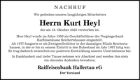 NACHRUF Wir gedenken unseres langjährigen Mitarbeiters Herrn Kurt Heyl der am 18. Oktober 2025 verstorben ist. Herr Heyl wurde im Jahre 1958 als Geschäftsführer der Vorgängerbank Raiffeisenkasse Reichertshausen eingestellt. Ab 1977 fungierte er als Zweigstellenleiter in der damaligen Filiale Reicherts­hausen, in der er bis zu seinem Eintritt in den Ruhestand im Jahr 1997 tätig war. Er trug dadurch wesentlich zur positiven Entwicklung unseres Unternehmens bei. In Dankbarkeit und tiefer Trauer nehmen wir Abschied und werden ihm stets ein ehrendes Andenken bewahren. Raiffeisenbank Hallertau eG Der Vorstand