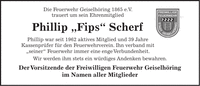 Die Feuerwehr Geiselhöring 1865 e.V. trauert um sein Ehrenmitglied Phillip 'Fips' Scherf Phillip war seit 1962 aktives Mitglied und 39 Jahre Kassenprüfer für den Feuerwehrverein. Ihn verband mit 'seiner' Feuerwehr immer eine enge Verbundenheit. Wir werden ihm stets ein würdiges Andenken bewahren. Der Vorsitzende der Freiwilligen Feuerwehr Geiselhöring im Namen aller Mitglieder