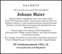 NACHRUF Wir trauern um unser Ehrenmitglied Johann Maier Johann Maier engagierte sich viele Jahre aktiv beim SV Grafentraubach. Nach seiner aktiven Zeit als Spieler brachte er sein handwerkliches Geschick beim Neubau und den Erweiterungen des Sportheims am Sportplatz ein. Danach galt seine ganze Aufmerksamkeit jahrelang der Pflege unserer Rasen- und Sportanlagen in Grafentraubach. Wir werden ihm stets ein ehrendes Andenken bewahren. Unser Mitgefühl gilt seinen trauernden Angehörigen. SV Grafentraubach 1932 e.V. Vorstandschaft und Mitglieder