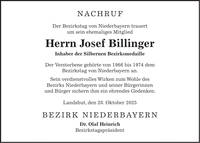 NACHRUF Der Bezirkstag von Niederbayern trauert um sein ehemaliges Mitglied Herrn Josef Billinger Inhaber der Silbernen Bezirksmedaille Der Verstorbene gehörte von 1966 bis 1974 dem Bezirkstag von Niederbayern an. Sein verdienstvolles Wirken zum Wohle des Bezirks Niederbayern und seiner Bürgerinnen und Bürger sichern ihm ein ehrendes Gedenken. Landshut, den 28. Oktober 2025 BEZIRK NIEDERBAYERN Dr. Olaf Heinrich Bezirkstagspräsident
