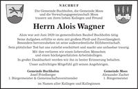 NACHRUF Die Gemeinde Buchhofen, die Gemeinde Moos und die Verwaltungsgemeinschaft Moos trauern um ihren lieben Kollegen und Freund Herrn Alois Wagner Alois war seit Juni 2020 im gemeindlichen Bauhof Buchhofen tätig. Seine Aufgaben erfüllte er stets mit großem Fleiß und Zuverlässigkeit. Besonders hervorzuheben ist seine außerordentliche Hilfsbereitschaft. Sein plötzlicher Tod hat uns zutiefst erschüttert und macht uns unfassbar traurig. Mit ihm verlieren wir einen liebevollen Menschen und einen höchstgeschätzten Arbeitskollegen. In großer Dankbarkeit werden wir ihn in bester Erinnerung behalten. Unser aufrichtiges Mitgefühl gilt seinen Angehörigen. Gemeinde Buchhofen Gemeinde Moos Josef Friedberger Alexander Zacher 1. Bürgermeister & Gemeinschaftsvorsitzender 1. Bürgermeister im Namen aller Kollegen und Kolleginnen