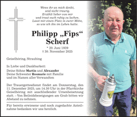 Wenn ihr an mich denkt, seid nicht traurig. Erzählt lieber von mir und traut euch ruhig zu lachen. Lasst mir einen Platz in eurer Mitte, so wie ich ihn im Leben hatte. Philipp 'Fips' Scherf * 20. Juni 1939 + 30. November 2025 Geiselhöring, Straubing In Liebe und Dankbarkeit: Deine Söhne Martin und Alexander Deine Schwester Rosmarie mit Familie und im Namen aller Verwandten Der Trauergottesdienst findet am Donnerstag, den 11. Dezember 2025, um 14.30 Uhr in der Pfarrkirche Geiselhöring mit anschließender Urnenbeisetzung statt. - Von Beileidsbezeigungen am Grab bitten wir Abstand zu nehmen. Für bereits erwiesene und noch zugedachte Anteilnahme bedanken wir uns herzlich.