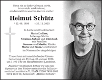 Wenn ein so lieber Mensch stirbt, ist er nicht wirklich tot, sondern lebt in unseren Herzen weiter. Helmut Schütz * 22. 08. 1956 + 20. 12. 2025 In Liebe und Dankbarkeit: Maria Daffner, Lebensgefährtin Stephan, Sabine und Christoph mit Familien Susanne und Martin, Kinder Maria und Franz, Geschwister im Namen aller Angehörigen Trauerfeier mit anschließender Urnen- bestattung am Freitag, 30. Januar 2026, um 11.00 Uhr im Hauptfriedhof Landshut. Anstelle von Blumen bitten wir um eine Spende an den Förderverein für die Palliativmedizin Landshut e.V., IBAN: DE***, Kennwort: 'Helmut Schütz'.
