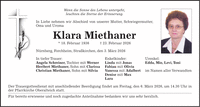 Wenn die Sonne des Lebens untergeht, leuchten die Sterne der Erinnerung. In Liebe nehmen wir Abschied von unserer Mutter, Schwiegermutter, Oma und Uroma Klara Miethaner * 18. Februar 1936 + 23. Februar 2026 Nürnberg, Forchheim, Straßkirchen, den 3. März 2026 In tiefer Trauer: Enkelkinder: Urenkel: Angela Schreiner, Tochter mit Werner Linda mit Jonas Edda, Mio, Levi, Toni Heribert Miethaner, Sohn mit Clarissa Fabian mit Olivia Christian Miethaner, Sohn mit Silvia Vanessa mit Adalbert im Namen aller Verwandten Denise mit Max Lara Der Trauergottesdienst mit anschließender Beerdigung findet am Freitag, den 6. März 2026, um 14.30 Uhr in der Pfarrkirche Oberalteich statt. Für bereits erwiesene und noch zugedachte Anteilnahme bedanken wir uns sehr herzlich.