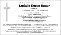 In Liebe und Dankbarkeit nehmen wir Abschied von Ludwig Eugen Bauer "Wiggerl" * 19. September 1954 _ 2. Oktober 2025 In unseren Herzen lebst Du weiter: Ehefrau Sandra Bauer Sohn Ludwig und Tochter Susanne mit Hermine Bauer Schwester Traudl Speckmaier mit Familie Schwester Agnes Schmid mit Familie Schwager Markus Lederer mit Familie im Namen aller Angehörigen Der Trauergottesdienst findet am Dienstag, den 21. Oktober 2025, um 9.30 Uhr in der Pfarrkirche St. Wolfgang statt, anschließend um 11.00 Uhr Beisetzung im Hauptfriedhof Landshut. Von Beileidsbekundungen am Grab bitten wir Abstand zu nehmen. Anstelle von Kranz- und Blumenspenden bitten wir um eine Spende an den Förderverein für Palliativmedizin Landshut e.V., IBAN: DE***, Verwendungszweck: "Ludwig Eugen Bauer".