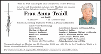 Wenn die Kraft zu Ende geht, ist es kein Sterben, sondern Erlösung. In Liebe und Dankbarkeit nehmen wir Abschied von unserer lieben Mutter, Schwiegermutter, Oma und Uroma Frau Anna Traidl geb. Traidl * 8. Mai 1948 _ 10. Dezember 2025 Rettenbach, Dörfling, Erpfenzell, Wörth a. d. Donau und Riekofen In liebevoller Erinnerung: Deine Kinder: Deine Enkel: Manuela mit Simon, Silvia, Martina mit Konrad Daniel mit Sabine, Anna mit Karlheinz Jasmin mit Johannes, Michael mit Kerstin, Monika mit Bernhard Julia mit Christoph, Stefan, Luis Theodor Deine Urenkel: Amelie, Leni, Franz mit Karin Ludwig, Sophie, Josef, Anton, Im Namen aller Verwandten Julian, Jasmin, Lena und Mia Trauergottesdienst am Montag, den 22. Dezember 2025, um 14.30 Uhr in der Pfarrkirche Wörth a. d. Donau mit anschließender Urnenbeisetzung. Für erwiesene und noch zugedachte Anteilnahme bedanken wir uns recht herzlich.
