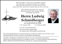 Wenn die Füße zu müde sind, noch Wege zu gehen, die Gedanken zu schwach, die Welt zu verstehen. Wenn das Alter geworden zur Last und zum Leid, spricht der Herr unser Gott: "Komm heim zu mir, es ist Zeit". Wir nehmen Abschied von unserem Ehemann, Dada, Opa, Uropa, Bruder, Schwager und Onkel Herrn Ludwig Schmidberger aus Grabitz/Furth im Wald * 25. August 1930 _ 14. Februar 2026 In Liebe und Dankbarkeit: die trauernden Angehörigen im Namen aller Verwandten und Freunde Der Trauergottesdienst ist am Donnerstag, 19. Februar 2026, um 13.30 Uhr in der Stadtpfarrkirche Furth im Wald, anschließend Beerdigung. Anstelle von Blumen und Kränzen bitten wir um eine Spende zugunsten: Förderverein Palliativstation im Landkreis Cham e. V. im Krankenhaus Bad Kötzting, IBAN: DE***, Kennwort: Ludwig Schmidberger.