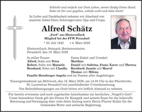 Schlicht und einfach war Dein Leben, immer fleißig Deine Hand. Ruhe ist Dir nun gegeben, schlafe wohl und habe Dank! In Liebe und Dankbarkeit nehmen wir Abschied von unserem lieben Vater, Schwiegervater, Opa und Uropa Alfred Schätz 'Fred' aus Hintersollach Mitglied bei der FFW Perasdorf * 20. Juli 1942 + 4. März 2026 Hintersollach, Steinach, Breitenweinzier, Perasdorf, den 16. März 2026 In stiller Trauer: Deine Enkel und Urenkel: Alfred, Sohn mit Petra Matthias Robert, Sohn mit Manuela Daniel mit Sabrina, Franz-Xaver und Theresa Bernhard, Sohn mit Claudia Bernhard, Jasmin mit Marcel Thomas mit Milena Familie Hornberger Angela und im Namen aller Angehörigen Trauergottesdienst am Mittwoch, den 18. März 2026, um 14.30 Uhr in der Pfarrkirche' St. Laurentius Perasdorf mit anschließender Urnenbeisetzung. Von Beileidsbezeigungen am Grab bitten wir höflich Abstand zu nehmen. Für bereits erwiesene und noch zugedachte Anteilnahme ein herzliches 'Vergelt's Gott'. Unser besonderer Dank gilt der Praxis Dr. Knappik und seinem Team für die liebevolle Betreuung und Versorgung über viele Jahre hinweg sowie Herrn Pfarrer Koller für die tröstenden Worte und seelische Begleitung.