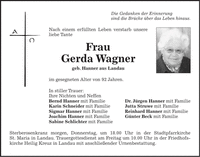 Die Gedanken der Erinnerung sind die Brücke über das Leben hinaus. Nach einem erfüllten Leben verstarb unsere liebe Tante Frau Gerda Wagner geb. Hanner aus Landau im gesegneten Alter von 92 Jahren. In stiller Trauer: Ihre Nichten und Neffen Bernd Hanner mit Familie Dr. Jürgen Hanner mit Familie Karin Schneider mit Familie Jutta Struwe mit Familie Sigmar Hanner mit Familie Reinhard Hanner mit Familie Joachim Hanner mit Familie Günter Beck mit Familie Sabine Schlichter mit Familie Sterberosenkranz morgen, Donnerstag, um 18.00 Uhr in der Stadtpfarrkirche St. Maria in Landau. Trauergottesdienst am Freitag um 10.00 Uhr in der Friedhofs- kirche Heilig Kreuz in Landau mit anschließender Urnenbestattung.