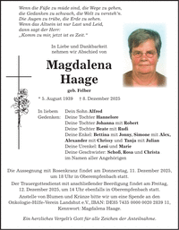 Wenn die Füße zu müde sind, die Wege zu gehen, die Gedanken zu schwach, die Welt zu versteh'n. Die Augen zu trübe, die Erde zu sehen. Wenn das Altsein ist nur Last und Leid, dann sagt der Herr: ,,Komm zu mir, jetzt ist es Zeit.'' In Liebe und Dankbarkeit nehmen wir Abschied von Magdalena Haage geb. Felber * 5. August 1939 + 8. Dezember 2025 In liebem Dein Sohn Alfred Gedenken: Deine Tochter Hannelore Deine Tochter Johanna mit Robert Deine Tochter Beate mit Rudi Deine Enkel: Bettina mit Jonny, Simone mit Alex, Alexander mit Chrissy und Tanja mit Julian Deine Urenkel: Leni und Marie Deine Geschwister: Schoß, Rosa und Christa im Namen aller Angehörigen Die Aussegnung mit Rosenkranz findet am Donnerstag, 11. Dezember 2025, um 18 Uhr in Oberempfenbach statt. Der Trauergottesdienst mit anschließender Beerdigung findet am Freitag, 12. Dezember 2025, um 14 Uhr ebenfalls in Oberempfenbach statt. Anstelle von Blumen und Kränze bitte wir um eine Spende an den Onkologie-Hilfe-Verein Landshut e.V., IBAN: DE***, Kennwort: Magdalena Haage. Ein herzliches Vergelt's Gott für alle Zeichen der Anteilnahme.