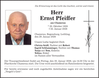 Die Erinnerung ist das Licht das leuchtet, wärmt und tröstet. Herr Ernst Pfeiffer aus Chamerau * 20. Oktober 1929 _ 22. Januar 2026 Chamerau, Regensburg, Loibling, den 29. Januar 2026 Unsere Liebe begleitet Dich: Christa Seidl, Tochter mit Robert Ingrid Schlamminger, Tochter mit Thomas Tanja mit Tom, Enkelin Tobias, Enkel im Namen aller Verwandten Der Trauergottesdienst findet am Freitag, den 30. Januar 2026, um 14.30 Uhr in der Pfarrkirche Chamerau statt. Die Urne wird anschließend im Familienkreis beigesetzt. Für bereits erwiesene und noch zugedachte Anteilnahme sagen wir ein herzliches