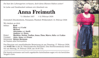 Du hast den Lebensgarten verlassen, doch deine Blumen blühen weiter! In Liebe und Dankbarkeit nehmen wir Abschied von Anna Freimuth * 3. Oktober 1937 + 12. Februar 2026 Gutendorf, Brackenheim, Niesassen, Thenhof, Wölkersdorf, 14. Februar 2026 Wir denken an dich: Söhne: Rudi Hans mit Uschi Michael Alexander mit Steffi Andreas mit Petra Enkel: Matthias, Stefan, Nadine, Jonas, Timo, Marco, Julia und Lukas Urenkel: Alois, Anna und Franz Schwester Helene Hermann im Namen aller Verwandten Das Requiem mit anschließender Beisetzung ist am Dienstag, 17. Februar 2026, um 10.00 Uhr in der St. Nikolauskirche Steinbühl. Den Sterberosenkranz beten wir am Montag, 16. Februar 2026, um 19.00 Uhr. Für bereits erwiesene und noch zugedachte Anteilnahme sagen wir ein herzliches Vergelt's Gott.
