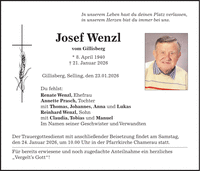 In unserem Leben hast du deinen Platz verlassen, in unserem Herzen bist du immer bei uns. Josef Wenzl vom Gillisberg * 8. April 1940 + 21. Januar 2026 Gillisberg, Selling, den 23.01.2026 Du fehlst: Renate Wenzl, Ehefrau Annette Prasch, Tochter mit Thomas, Johannes, Anna und Lukas Reinhard Wenzl, Sohn mit Claudia, Tobias und Manuel Im Namen seiner Geschwister und Verwandten Der Trauergottesdienst mit anschließender Beisetzung findet am Samstag, den 24. Januar 2026, um 10.00 Uhr in der Pfarrkirche Chamerau statt. Für bereits erwiesene und noch zugedachte Anteilnahme ein herzliches 'Vergelt's Gott'!