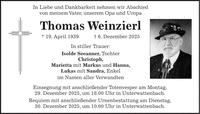 In Liebe und Dankbarkeit nehmen wir Abschied von meinem Vater, unserem Opa und Uropa Thomas Weinzierl * 19. April 1939 + 6. Dezember 2025 In stiller Trauer: Isolde Seeanner, Tochter Christoph, Marietta mit Markus und Hanna, Lukas mit Sandra, Enkel im Namen aller Verwandten Einsegnung mit anschließender Totenvesper am Montag, 29. Dezember 2025, um 18.00 Uhr in Unterwattenbach. Requiem mit anschließender Urnenbestattung am Dienstag, 30. Dezember 2025, um 10.00 Uhr in Unterwattenbach.