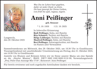 Was Du im Leben hast gegeben, dafür ist jeder Dank zu klein. Du hast gesorgt für Deine Lieben, von früh bis spät, tagaus, tagein. Anni Peißinger geb. Strasser * 1. 10. 1938 + 21. 10. 2025 In liebevoller Erinnerung: Rudi Peißinger, Sohn, mit Familie Rita Schmierl, Tochter, mit Familie Helga Lohberger, Tochter, mit Familie Manfred Peißinger, Sohn, mit Familie Resi Peißinger, Schwiegertochter, mit Familie im Namen aller Verwandten Sammelrosenkranz am Mittwoch, den 29. Oktober 2025, um 18.30 Uhr in Gundihausen. Trauergottesdienst mit anschließender Urnenbeisetzung am Freitag, den 31. Oktober 2025, um 10.00 Uhr in Gundihausen. Anstelle von Blumen und Kränzen bitten wir im Sinne unserer Mama um eine Spende an die 'Steyler Mission', IBAN: DE***, Verwendungszweck: 'Proj. Pater Dan Anzorge Mis 1716', Kennwort: Anni Peißinger. Für bereits erwiesene und noch zugedachte Anteilnahme danken wir herzlich. Langenvils, den 29. Oktober 2025