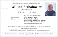 In stiller Trauer nehmen wir Abschied von Willibald Thalmeier 'Wirt z'Rosenau' * 5. 12. 1939 + 27. 1. 2026 In Liebe und Dankbarkeit: Rosenau und Sohn Willi mit Maria Zustorf Tochter Gabi mit Toni Enkel Stefan, Sandra und Brigitte Schwester Annemarie mit Familie im Namen aller Angehörigen Trauerfeier am Mittwoch, 4. Februar 2026, um 14.00 Uhr in Zustorf, anschließend Beerdigung. Von Beileidsbezeigungen am Grab bitten wir Abstand zu nehmen. Für bereits erwiesene und noch zugedachte Anteilnahme danken wir herzlich.