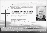 Du hast verloren, was nicht zu gewinnen war - doch gekämpft hast du mit Würde, mit Liebe und mit Mut. Dein Leid ist nun zu Ende, dein Platz in unseren Herzen bleibt. Traurig nehmen wir Abschied von meinem geliebten Ehemann, unserem Vater, Schwieger­vater, Opa und Bruder Herrn Peter Bode * 10. August 1957 + 21. Oktober 2025 Grafenwiesen, Blaibach, Duisburg, den 29. Oktober 2025 Wir werden dich sehr vermissen: Deine Ehefrau Anita Deine Tochter Jenny mit Paulina und Lea Deine Söhne Matthias und Tobias Deine Geschwister Angelika, Carmen und Jürgen mit Familien im Namen aller Verwandten Das Requiem mit anschließender Urnenbeisetzung ist am Freitag, den 31. Oktober 2025, ­ um 15.00 Uhr in der Pfarrkirche Grafenwiesen. Für bereits erwiesene und noch zugedachte Anteilnahme sagen wir ein herzliches ­Vergelt's Gott.