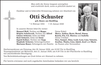 Man sieht die Sonne langsam untergehen und erschrickt doch, wenn es plötzlich dunkel ist. Dankbar und in liebevoller Erinnerung nehmen wir Abschied von Otti Schuster geb. Bauer, aus Haidlfing * 9. Februar 1932 + 16. Januar 2026 In unseren Herzen lebst Du weiter: Hannerl Wolf, Tochter mit Beppo Deine Enkel: Brigitte Schafaczek, Tochter mit Alfred Marco, Andrea, Beate, Bernd, Simon, Günter Schuster, Sohn mit Gisi Katrin, Fin, Uli, Theresa und Isabella Kurt Schuster, Sohn mit Irene Deine Urenkel: Ingrid Zollner, Tochter mit Sepp Nico, Samuel, Alina, Leah, Leon, Lina, Valentin, Sieglinde Schuster, Schwiegertochter Josefine, Thalea, Lino, Jakob, Josef und Marie Marianne Bauer, Schwägerin mit Familie im Namen aller Verwandten Sterberosenkranz am Dienstag, den 20. Januar 2026, um 18.00 Uhr in Haidlfing. Trauergottesdienst am Mittwoch, den 21. Januar 2026, um 9.30 Uhr in der Pfarrkirche in Haidlfing mit anschließender Beerdigung. Von Beileidsbekundungen am Grab bitten wir Abstand zu nehmen. Für bereits erwiesene und noch zugedachte Anteilnahme bedanken wir uns herzlich.