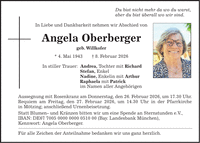 Du bist nicht mehr da wo du warst, aber du bist überall wo wir sind. In Liebe und Dankbarkeit nehmen wir Abschied von Angela Oberberger geb. Willkofer * 4. Mai 1943 + 8. Februar 2026 In stiller Trauer: Andrea, Tochter mit Richard Stefan, Enkel Nadine, Enkelin mit Arthur Raphaela mit Patrick im Namen aller Angehörigen Aussegnung mit Rosenkranz am Donnerstag, den 26. Februar 2026, um 17.30 Uhr. Requiem am Freitag, den 27. Februar 2026, um 14.30 Uhr in der Pfarrkirche in Mötzing; anschließend Urnenbeisetzung. Statt Blumen- und Kränzen bitten wir um eine Spende an Sternstunden e.V., IBAN: DE*** (Bay. Landesbank München), Kennwort: Angela Oberberger. Für alle Zeichen der Anteilnahme bedanken wir uns ganz herzlich.