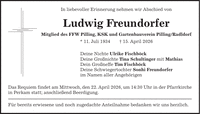 In liebevoller Erinnerung nehmen wir Abschied von Ludwig Freundorfer Mitglied des FFW Pilling, KSK und Gartenbauverein Pilling/Radldorf * 11. Juli 1934 + 15. April 2026 Deine Nichte Ulrike Fischböck Deine Großnichte Tina Schultinger mit Mathias Dein Großneffe Tim Fischböck Deine Schwiegertochter Sonhi Freundorfer im Namen aller Angehörigen Das Requiem findet am Mittwoch, den 22. April 2026, um 14:30 Uhr in der Pfarrkirche in Perkam statt; anschließend Beerdigung. Für bereits erwiesene und noch zugedachte Anteilnahme bedanken wir uns herzlich.