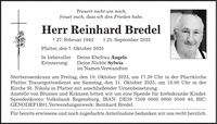 Trauert nicht um mich, freuet euch, dass ich den Frieden habe. Herr Reinhard Bredel * 27. Februar 1942 + 25. September 2025 Pfatter, den 7. Oktober 2025 In liebevoller Deine Ehefrau Angela Erinnerung: Deine Nichte Sylwia im Namen Verwandten Sterberosenkranz am Freitag, den 10. Oktober 2025, um 17.30 Uhr in der Pfarrkirche Pfatter. Trauergottesdienst am Samstag, den 11. Oktober 2025, um 10.00 Uhr in der Kirche St. Nikola in Pfatter mit anschließender Urnenbeisetzung. Anstelle von Blumen und Kränzen bitten wir um eine Spende für krebskranke Kinder. Spendenkonto: Volksbank Regensburg, IBAN: DE***, BIC: GENODEF1R01,Verwendungszweck: Reinhard Bredel. Für bereits erwiesene und noch zugedachte Anteilnahme bedanken wir uns recht herzlich.