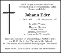 Nach langer, schwerer Krankheit verschied mein lieber Ehemann, Vater, Bruder und Onkel Johann Eder * 17. Juni 1937 + 28. September 2025 In stiller Trauer: Therese, Ehefrau Franz, Sohn Juliane, Schwester im Namen aller Verwandten Trauergottesdienst ist am Dienstag, 7. Oktober 2025, um 15.00 Uhr in der Pfarrkirche St. Erhard in Oberahrain, anschließend Beerdigung in Oberahrain. Herzlichen Dank für alle Zeichen der Anteilnahme.
