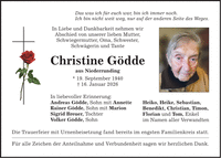 Das was ich für euch war, bin ich immer noch. Ich bin nicht weit weg, nur auf der anderen Seite des Weges. In Liebe und Dankbarkeit nehmen wir Abschied von unserer lieben Mutter, Schwiegermutter, Oma, Schwester, Schwägerin und Tante Christine Gödde aus Niederrunding * 19. September 1940 _ 16. Januar 2026 In liebevoller Erinnerung: Andreas Gödde, Sohn mit Annette Rainer Gödde, Sohn mit Marion Sigrid Breuer, Tochter Volker Gödde, Sohn Die Trauerfeier mit Urnenbeisetzung fand bereits im engsten Familienkreis statt. Für alle Zeichen der Anteilnahme und Verbundenheit sagen wir herzlichen Dank. Heiko, Heike, Sebastian, Benedikt, Christian, Timon, Florian und Tom, Enkel im Namen aller Verwandten