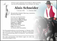 Ich bin so gern gegangen durch Wiesen, Wald und Flur; nun bin ich heimgegangen zum Schöpfer der Natur. Alois Schneider * 25. Juni 1955 + 1. Oktober 2025 Rumplmühle, Kuglhof, Maiering, Lederdorn, Haunried, Walting In Liebe und Dankbarkeit: Deine Ehefrau Rosemarie Deine Tochter Julia mit Josef Dein Enkel Maximilian Ludwig mit Andrea Fanny, Josef, Karl, Geschwister mit Familien Gabi, Schwägerin im Namen aller Verwandten Der Trauergottesdienst ist am Dienstag, 14. Oktober 2025, um 15.00 Uhr in der Pfarrkirche St. Michael in Rimbach. Die Urnenbeisetzung findet im Familien- und Freundeskreis statt. Für allen Anteilnahme und Gebete sagen wir allen ein herzliches Vergelt's Gott.
