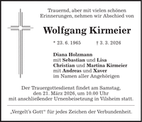 Trauernd, aber mit vielen schönen Erinnerungen, nehmen wir Abschied von Wolfgang Kirmeier * 23. 6. 1965 + 3. 3. 2026 Diana Holzmann mit Sebastian und Lisa Christian und Martina Kirmeier mit Andreas und Xaver im Namen aller Angehörigen Der Trauergottesdienst findet am Samstag, den 21. März 2026, um 10.00 Uhr mit anschließender Urnenbeisetzung in Vilsheim statt. 'Vergelt's Gott' für jedes Zeichen der Verbundenheit.