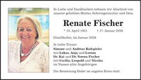 In Liebe und Dankbarkeit nehmen wir Abschied von unserer geliebten Mutter, Schwiegermutter und Oma Renate Fischer * 10. April 1951 + 17. Januar 2026 Gündlkofen, im Januar 2026 In tiefer Trauer: Simone und Andreas Radspieler mit Lukas, Anja und Lorenz Dr. Kai und Dr. Verena Fischer mit Cecilia, Leopold und Nicolas im Namen aller Angehörigen Die Beisetzung findet im engsten Kreis statt.