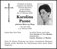 Oyster Bay, New York Friedlich im Schlaf, umgeben von Familie, verstarb Karolina in den frühen Morgenstunden des 12. Februar 2026. Karolina Paone geborene Meier aus Weng * 23. Juli 1935 _ 12. Februar 2026 Nach 36 Jahren Trennung von ihrem verstorbenen Ehemann Gerald, wurde Karolina am Valentinstag neben ihrem Mann beigesetzt. In stiller Trauer und Liebe: Sohn Lucian mit Frau Bernice Enkelkinder Lucian, Arianna und Karina