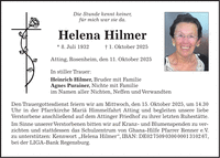 Die Stunde kennt keiner, für mich war sie da. Helena Hilmer * 8. Juli 1932 + 1. Oktober 2025 Atting, Rosenheim, den 11. Oktober 2025 In stiller Trauer: Heinrich Hilmer, Bruder mit Familie Agnes Purainer, Nichte mit Familie im Namen aller Nichten, Neffen und Verwandten Den Trauergottesdienst feiern wir am Mittwoch, den 15. Oktober 2025, um 14.30 Uhr in der Pfarrkirche Mariä Himmelfahrt Atting und begleiten unsere liebe Verstorbene anschließend auf dem Attinger Friedhof zu ihrer letzten Ruhestätte. Im Sinne unserer Verstorbenen bitten wir auf Kranz- und Blumenspenden zu verzichten und stattdessen das Schulzentrum von Ghana-Hilfe Pfarrer Renner e.V. zu unterstützen: Kennwort 'Helena Hilmer', IBAN: DE***, bei der LIGA-Bank Regensburg.