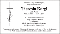 Wenn die Kraft zu Ende geht, ist Erlösung Gnade. Theresia Kargl geb. Bauer * 10. 2. 1936 + 10. 1. 2026 In Liebe und Dankbarkeit: Georg Kargl mit Sigrid Irmi Kargl Birgit Kargl mit Gerd und Martin im Namen aller Verwandten Trauergottesdienst am Dienstag, 27. Januar 2026, um 10 Uhr in St. Vinzenz von Paul, anschließend Urnenbestattung im Friedhof Auloh.