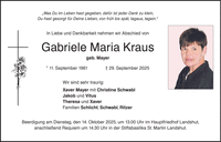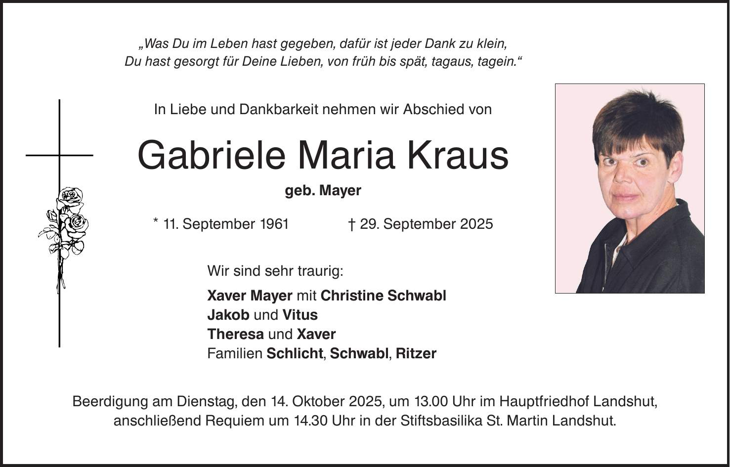 "Was Du im Leben hast gegeben, dafür ist jeder Dank zu klein, Du hast gesorgt für Deine Lieben, von früh bis spät, tagaus, tagein." In Liebe und Dankbarkeit nehmen wir Abschied von Gabriele Maria Kraus geb. Mayer * 11. September 1961 _ 29. September 2025 Wir sind sehr traurig: Xaver Mayer mit Christine Schwabl Jakob und Vitus Theresa und Xaver Familien Schlicht, Schwabl, Ritzer Beerdigung am Dienstag, den 14. Oktober 2025, um 13.00 Uhr im Hauptfriedhof Landshut, anschließend Requiem um 14.30 Uhr in der Stiftsbasilika St. Martin Landshut.