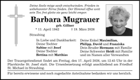Deine Seele möge sanft entschwinden. Frieden in unbekannter Ferne finden. Der Himmel öffne weit sein Tor, frei gleite sie ganz leicht empor. Barbara Mugrauer geb. Gillner * 11. April 1942 _ 19. März 2026 Straubing In Liebe und Dankbarkeit: Deine Tochter Sabine mit Josef Deine Tochter Bettina mit Matthias Der Trauergottesdienst findet am Freitag, den 17. April 2026, um 12.45 Uhr in der Pfarrkirche St. Josef statt. Die Urnenbeisetzung erfolgt anschließend am Friedhof St. Michael in Straubing. Für bereits erwiesene und noch zugedachte Anteilnahme bedanken wir uns herzlich. Deine Enkel Maximilian, Philipp, David und Franziska Dein Bruder Hermann mit Familie Deine Schwester Heidi mit Familie und im Namen aller Verwandten